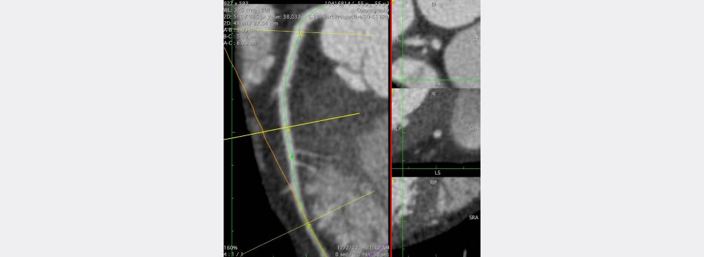 Χαρακτηριστική εικόνα αξονικής στεφανιογραφίας, η οποία απεικονίζει επιμήκη αθηρωματική πλάκα στο πρόσθιο κατιόντα κλάδο (κόκκινο βέλος) με συνοδό μέτρια στένωση έως 70%.